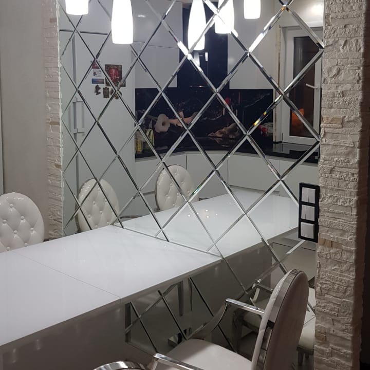Использована квадратная серебристая зеркальная плитка размером 18х18.